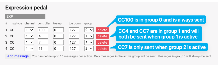 This example will send CC100 in group 0, which means it will always be sent if the expression pedal is moved.