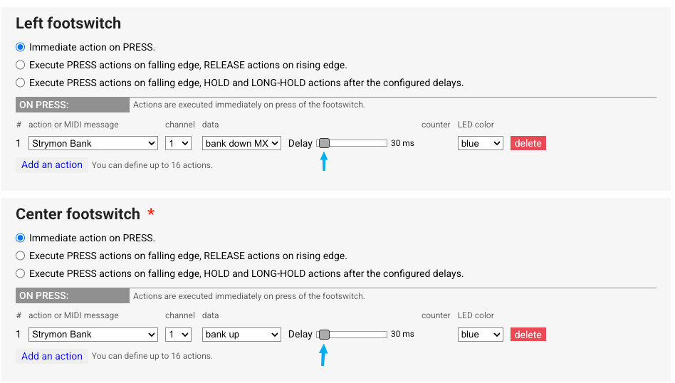 We’ve also added some additional parameters to the Strymon Bank command. The new BigSky MX pedal has a slightly different command structure and will not work with our existing setup, so we’ve added the Bank Down MX action and a new Delay slider to the editor.